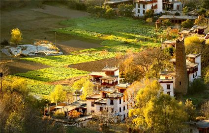 甲居藏寨依山面水,紅白相間的民居從大金河谷層層疊疊向上攀援,錯(cuò)落有致的散布在山坡上,樹葉漸次褪綠,漸染紅色,山頂是皚皚白雪,將田園牧歌式的畫卷展示在人們眼前。