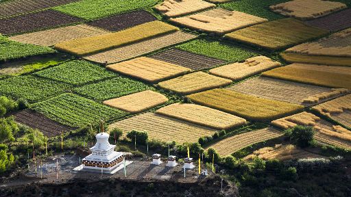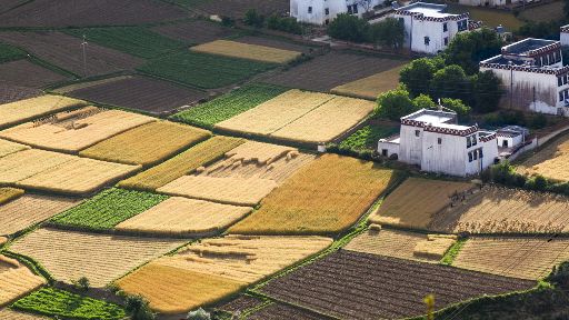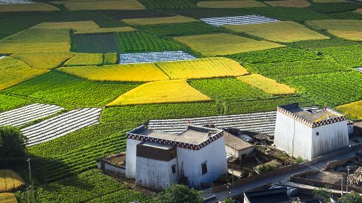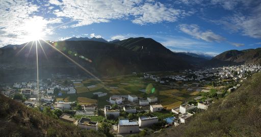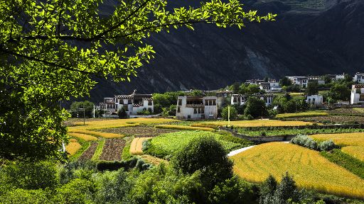 清晨,瓦藍(lán)瓦藍(lán)的天空云霧繚繞,周?chē)木拔镆黄鼥V,就好像童話(huà)里的仙境,一會(huì)兒,太陽(yáng)從東邊冉冉升起,霧也漸漸消失,村子里屋頂上飄著裊裊煨桑的煙子,我站在山岡上從高處向下俯望,只見(jiàn)高山峽谷之中,層層翠綠的梯田簇?fù)碇l(xiāng)城特有的白藏房,山下的田野,就像一片金色的海洋,將秀麗的田園裝扮得更加如詩(shī)如畫(huà)。一陣晨風(fēng)吹過(guò),麥田上蕩起了一道道金色的波紋,遠(yuǎn)處傳來(lái)了畫(huà)眉鳥(niǎo)的歌聲,我被眼前的一切迷住了,仿佛一切都靜止了,她讓我的夢(mèng)從這里開(kāi)始。
