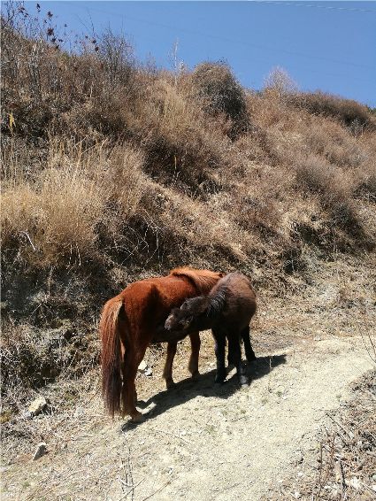 晴天里有陽光,陽光總是充滿愛和溫馨,無論人或是動物,母愛都是最寶貴的甘露。行走在阿里布果,無限愜意油然而生,徜徉在陽光的懷抱,心寧而靜。突然,馬鳴聲打破了這份寧靜,一匹黃馬一邊吃著草,一邊吼叫,不一會兒,一匹小馬駒飛奔而來,走到黃馬身旁,吮吸著甘甜的乳汁。天很藍(lán),陽光很溫暖,世上有一種最美麗的聲音,那便是母親的呼喚。