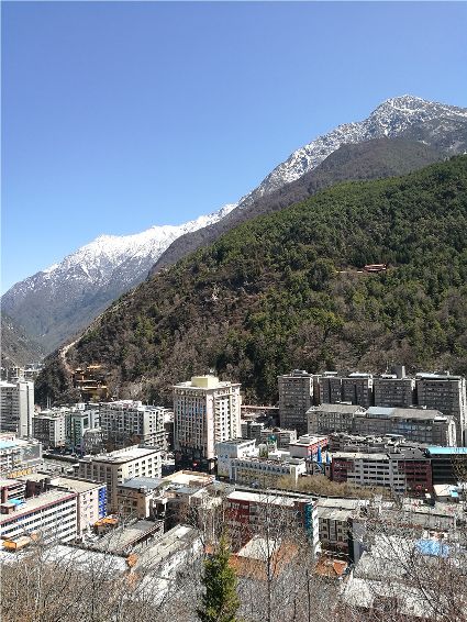 天空像剛被浸染的綢緞,蔚藍(lán)的主色已經(jīng)略顯;白雪好似從浸染的綢緞上滴落下的顏料與其它顏色的混合,眷戀的駐足在山尖,在其耳旁傾訴來年的約定;一顆顆萬年青穩(wěn)穩(wěn)的站立,將山中的寺廟、亭閣緊緊地包圍,見證著康定四季輪回的變化;依然披著秋冬贈予黃色外衣的樹木,拋開桎梏,堅(jiān)守在一座座樓房旁。藍(lán)與白,黃與綠……這大美的晴天為人們帶來了別樣的視覺盛宴。