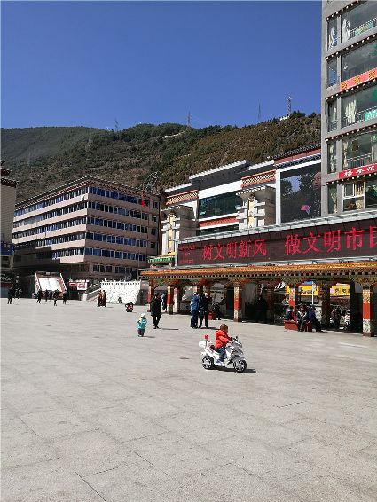 陽光碎碎的灑下,穿透過空氣,我們一邊狠吸含有陽光的空氣,一邊欣賞陽光下別樣的風(fēng)景。石階兩旁,稚嫩的小草汲取了前幾天的雨水,趁著天朗氣清正努力破土;靈動的小樹像正在站哨的士兵,認(rèn)真而仔細(xì);微風(fēng)拂過,經(jīng)幡隨著風(fēng)的節(jié)奏飄揚(yáng),太陽能路燈的風(fēng)扇慵懶的轉(zhuǎn)著,遠(yuǎn)望陽光下的康定城,是那樣的寧靜祥和。