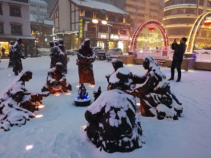 “風雨送春歸,飛雪迎春到。已是懸崖百丈冰,猶有花枝俏?!?月4日傍晚,大片大片的雪花,從昏暗的天空中紛紛揚揚飄落下來。霎時間,山川、河流、城市,全都籠罩在白蒙蒙的大雪之中。黃昏的雪,下得深切切的,好象有千絲萬縷的情緒似的,又像海水一般洶涌,能夠淹沒一切,還有一絲揭開藏頭露尾般的裸露感。雪花形態(tài)萬千、晶瑩透亮,好象出征的戰(zhàn)士,披著銀色的盔甲,又像是一片片白色的戰(zhàn)帆在遠航…… 落光了葉子的柳樹上,掛滿了毛茸茸、亮晶晶的銀條兒;冬夏常青的松樹和柏樹,堆滿了蓬松松、沉甸甸的雪球。那一片雪花在空中舞動著各種姿勢,或飛翔,或盤旋,或直直地快速墜落,鋪落在地上?!昂鋈缫灰勾猴L來,千樹萬樹梨花開”——這是雪的燦爛;一場瑞雪,扮美了康定,年味籠罩的康定城,嫵媚妖嬈。無論是背水姑娘、有著年味兒的將軍橋,還是大紅燈籠高高掛的康定門,都在雪后別有一番景致。與美景合影、和朋友玩雪都是最佳選擇。在風雪中,交警不畏嚴寒默默堅守崗位 ,指揮交通疏堵保暢。他們的身影在皚皚風雪路上站成一道道最美的風景,溫暖了康定。從早上六點開始,康定的環(huán)衛(wèi)工就迎著刺骨的寒風,開始了除冰雪保通暢的行動,在積雪覆蓋的康定城,早起的商販樂呵呵地做起了買賣;民工迎著雪后的寒風出門務工,他們是最可敬的人。