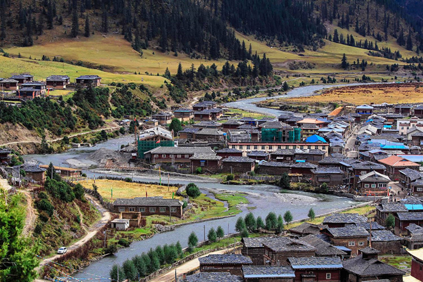 石板藏寨保留著原始的藏式民居文化,一宅一院,一磚一瓦的建造都是居民用石板蓋成,錯(cuò)落有致、古樸大氣。這里地勢(shì)平坦、神山環(huán)抱,開闊的草地上河水蜿蜒流過(guò),百花盛開五彩斑斕,美景恍若天堂,藏房令人向往。
