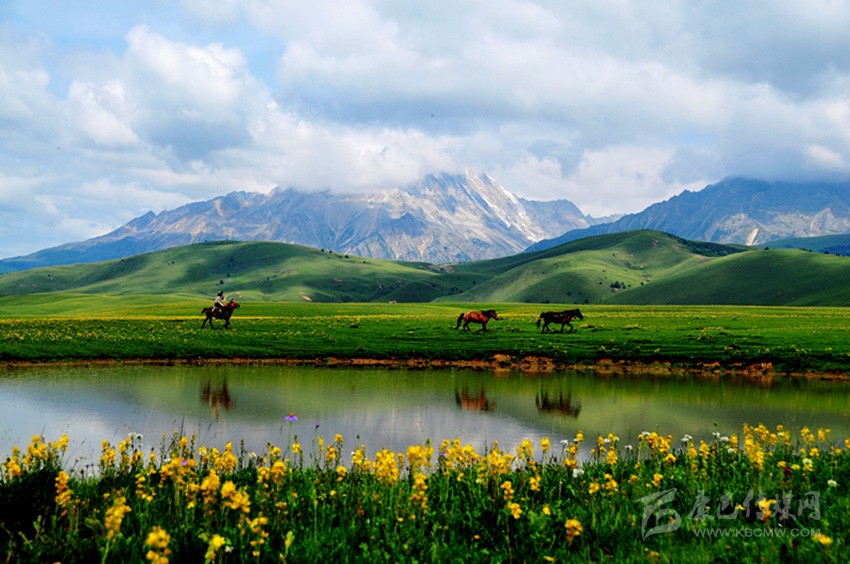 夕陽照耀湖水,閃著金銀光;綠樹撐著青天,到處莽蒼蒼;牧民家的房子,五彩斑斕樣;藍(lán)色天空之上,白云在飄蕩;青石河岸之畔,繽紛百花香……這里是寫生的圣殿,這里有攝影的天堂,這里是讓人魂牽夢縈的夢里仙鄉(xiāng)。