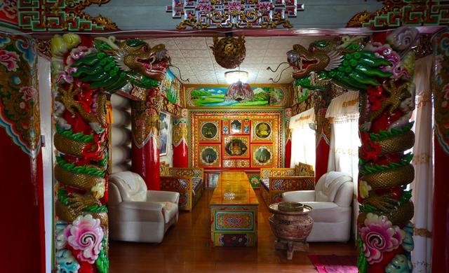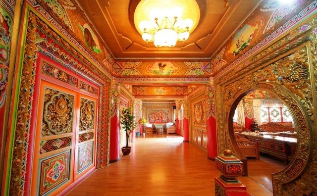 道孚民居室內(nèi)精雕細鏤,描金繪彩,每一個圖案或圖畫就是一個吉祥物或一個傳說。民居客廳陳設(shè)豪華,富麗堂皇,極顯主人的富有;經(jīng)堂供奉佛像,酥油燈長明,是家中的清靜之地;臥室多用箱式或椅式藏床,陳設(shè)溫馨而別具風情。