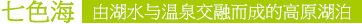位于仙乃日與央邁勇之間,海拔4600米,在牛奶海的上方,翻上一片陡峭的山岡,再上升100 多米,在山脊上就能俯瞰五色海了,湖面呈圓形。面積0.7 公頃,水色變化無窮。五色海由于會在光的折射下,產生五種不同的顏色而得名。其藏名為“木底錯”、“單增錯”,是藏族聚居區(qū)著名的圣湖(佛經中贊譽該湖與西藏羊卓雍錯齊名),據傳能“返演歷史,預測未來”,有很多宗教上的傳說。