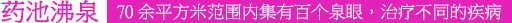 稱為藥泉的沸泉群水溫高達90℃,含有多種對人體有益的元素,不同的泉眼(如明目泉、健胃泉、洗腳泉等),分別對治療眼疾、胃病、風濕等病癥具有不同的療效。