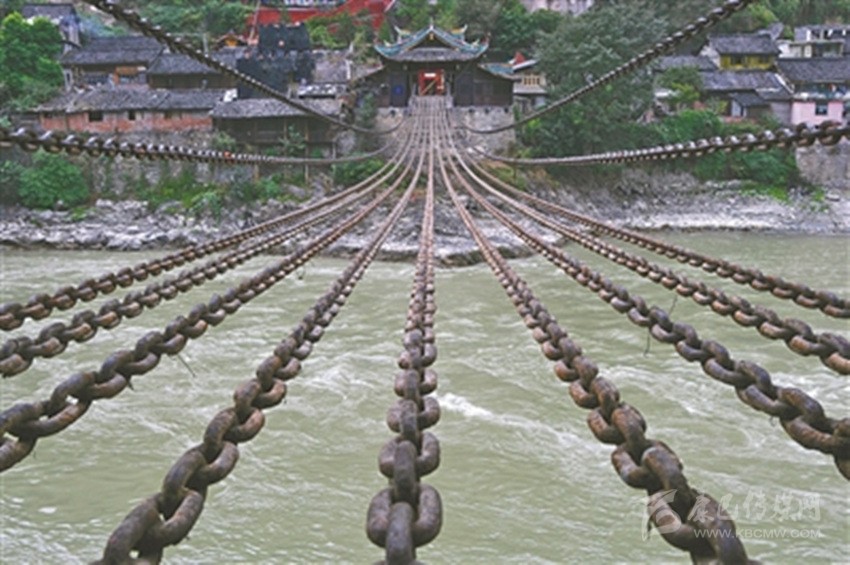 “瀘定橋”有人又稱“鐵索橋”。相傳康熙帝統(tǒng)一中國后,為了加強(qiáng)川藏地區(qū)的文化經(jīng)濟(jì)交流而御批修建此橋,并在橋頭立御牌。1935年,中國工農(nóng)紅軍在長征途中“飛奪瀘定橋”,使之成為中國共產(chǎn)黨重要的歷史紀(jì)念地。1961年,瀘定橋被中華人民共和國國務(wù)院公布為第一批全國重點(diǎn)文物保護(hù)單位之一。瀘定橋全長103.67米,寬3米,由橋身、橋臺、橋亭三部分組成:橋身由13根碗口粗的鐵鏈組成,左右兩邊各2根,是橋欄,底下并排9根,鋪上木板,就是橋面。每根鐵鏈由862至997個由熟鐵手工打造的鐵環(huán)相扣,總重量達(dá)21噸。