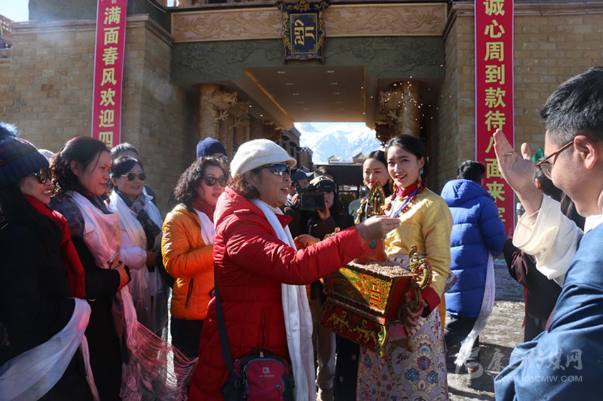 游客們剛到格薩爾王城門口就滿滿地感受到了當(dāng)?shù)厝嗣竦臒崆?,“嶺國(guó)四位大將”和“格薩爾王王妃”盛裝在城門口擊鼓迎接遠(yuǎn)道而來(lái)的客人們,為他們獻(xiàn)哈達(dá)、敬青稞酒,帶領(lǐng)大家轉(zhuǎn)煨桑爐祈福,在切瑪盒前體驗(yàn)灑青稞和糌粑祈福儀式。隨后,游客們?cè)谕醭求w驗(yàn)了喝圣水、祈福、騎馬、射箭等項(xiàng)目。王城內(nèi)宏偉的建筑,獨(dú)特的文化魅力,優(yōu)質(zhì)的服務(wù)質(zhì)量,讓遠(yuǎn)道而來(lái)的游客贊不絕口。