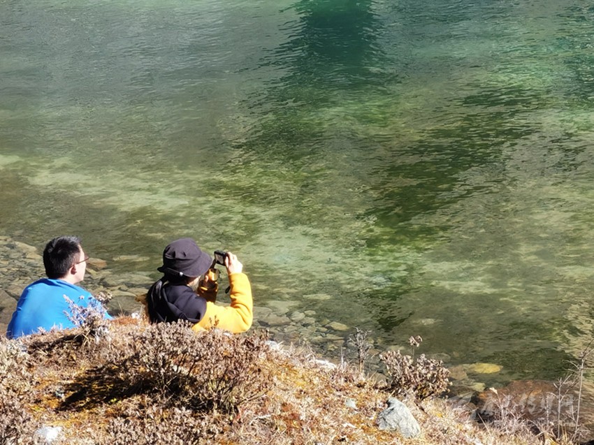 白海子的美較其他海子來說,就在于湖水的顏色,貢嘎青旅的顧問狼哥介紹說,現(xiàn)在大家喜歡叫白海子為翡翠海,就是因?yàn)樗念伾缫粔K藍(lán)綠的翡翠鑲嵌在高山的懷抱中,隨著光線的不同顏色變幻莫測(cè)。在康定的眾多海子中,這樣的顏色很少見,也更吸引人。