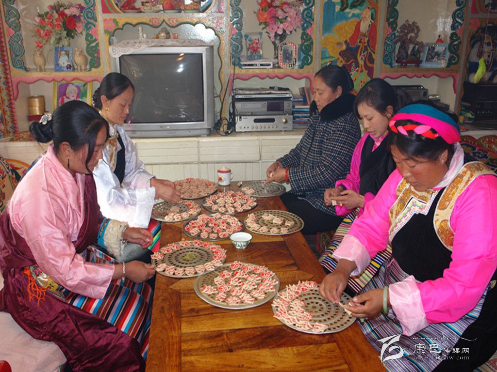 巴塘人一年當(dāng)中有很多重要的節(jié)日,而最重要的莫過(guò)于過(guò)春節(jié)。隨著農(nóng)歷新年的來(lái)臨,巴塘人過(guò)春節(jié)的氛圍也越來(lái)越濃烈了。掃塵、貼春聯(lián)、殺年豬、罐血腸、樹(shù)經(jīng)幡、獻(xiàn)“切瑪” 、曬牛肉干、做長(zhǎng)面、炸“花茹” 、 釀青稞酒等等。一時(shí)間,人們臉上綻放出春天的笑顏,讓人仿佛看到了春的腳步。在眾多的風(fēng)味飲食中,炸“花茹” 、 吃長(zhǎng)面(當(dāng)?shù)厝朔Q之為“金絲面”)是巴塘人春節(jié)時(shí)家筵中必不可缺的美食佳肴。