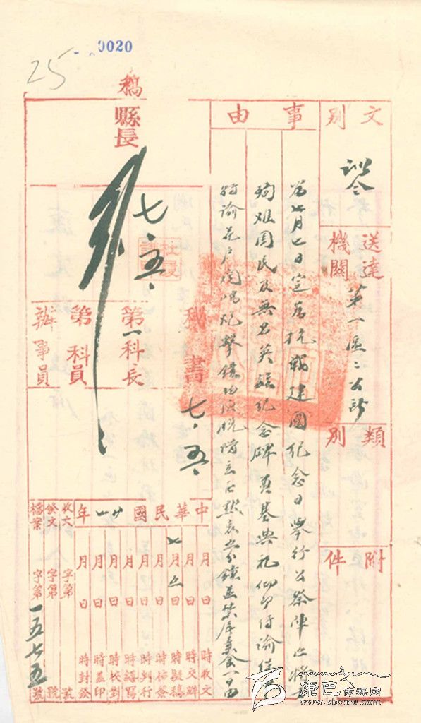民國27年,即1838年7月5日,康定縣政府縣長杜履謙發(fā)出“訓(xùn)令”,內(nèi)容如下:“查7月7日為盧溝橋抗戰(zhàn)周年紀(jì)念日,經(jīng)民國政府軍事委員會電請行政院特令各省市、鎮(zhèn):特定是日為抗戰(zhàn)建國紀(jì)念日。是日全體民眾均應(yīng)向抗戰(zhàn)陣亡將士及死難國民舉行公祭,并舉行無名英雄紀(jì)念碑奠基典禮。正午12時,聞中山臺鳴炮,警察籌備處擊鐘,本城全市民,無論室內(nèi)室外,一律脫帽立正默哀五分鐘。禁止屠宰,素食一日。此令”。