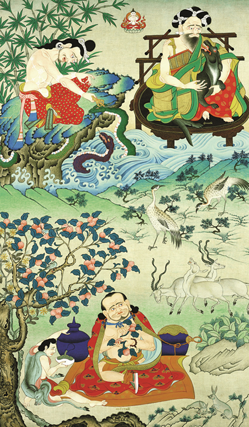 而從外部來看,元朝開始,西藏正式納入中國版圖,中原漢地的繪畫和西藏唐卡也大大增加了融匯交流的可能性。明朝延續(xù)了元朝對西藏的權(quán)力控制。政治關(guān)系日益穩(wěn)固,漢藏關(guān)系愈發(fā)融洽,文化交流也日漸繁盛。隨著漢地羅漢畫和青綠山水畫的技法大量進(jìn)入西藏。于是唐卡繪畫從十五世紀(jì)開始逐漸弱化印度、尼泊爾的影響,主動(dòng)學(xué)習(xí)、借鑒漢地的繪畫藝術(shù)。這是一個(gè)巨大的美學(xué)沖擊,它直接助攻了西藏唐卡本土化的進(jìn)程。