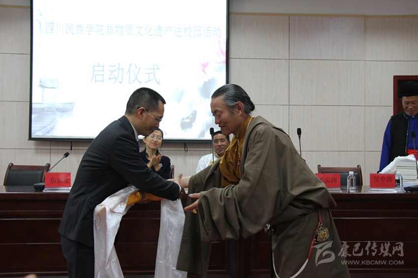 現(xiàn)場,世界非物質(zhì)文化遺產(chǎn)《格薩爾》說唱傳承人阿尼、州級非物質(zhì)文化《瀘定山歌》代表性傳承人吳全清分別將自己在非物質(zhì)文化遺產(chǎn)研究過程中撰寫的經(jīng)文、書籍贈送給學(xué)院。此外,省級非遺文化嵐安鍋莊代表性傳承人黃能貴、音樂舞蹈學(xué)院教師邱敏作為代表發(fā)言。