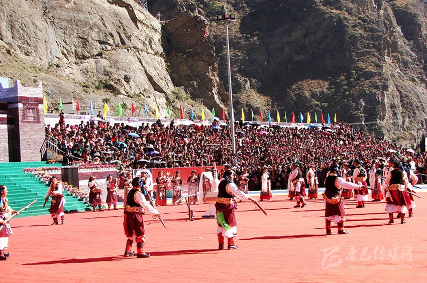 槍舞,嘉絨語中稱為“訥沖呷兒”,主要是在祭祀、集會、節(jié)日時表演的一種近似于戰(zhàn)術的舞蹈。在舞蹈中,舞者圍成一個圓圈,手持明火槍,明火槍,是最早的一種真正適于在戰(zhàn)場上為軍事目的使用的火槍。槍膛為一根圓柱形的鐵筒,筒口直徑為三厘米左右,在槍膛底部,有一個小圓孔伸出槍管,為導火管。如耳朵狀,因此也稱為槍耳,主要是用來點火的地方。圓筒固定在堅硬的木托頂端。這種輕火器或者說小型火炮使用的是形狀不規(guī)則的彈丸,即不大的實心彈,它緊貼大粒火藥制成的裝藥,借緊挨導火孔的火繩發(fā)射。