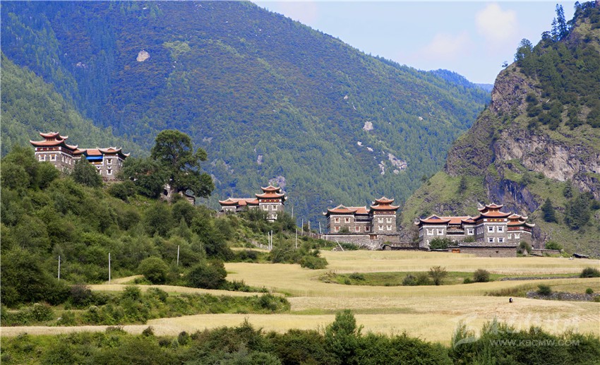 藏寨從大金河谷層層疊疊向上攀緣,在相對(duì)高差近千米的山坡上,一幢幢藏式樓房或星羅棋布,或稠密集中,錯(cuò)落有致。不時(shí)炊煙裊裊、云霧繚繞,詩(shī)情畫意。