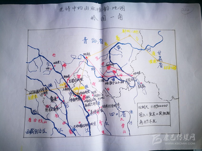 幾十個春秋里,劉安全所做的遠(yuǎn)不止這些。他還自制了平面地圖、格薩爾王族譜圖等。根據(jù)實(shí)地考察所見,他繪制了43個“嶺”國城堡遺址地形簡圖,記者見到了其中幾幅。圖中,大山、河湖、遺址等清晰可見,不失為了解格薩爾史詩的上好資料。