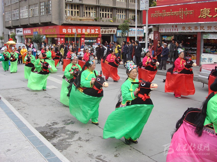 半個世紀(jì)風(fēng)靡康定城的“船燈”、“馬馬燈”、“鬧山鼓”、“扭秧歌”、“笑頭和尚戲柳翠”、“霸王鞭”……整個兒就像老陜過年時的“社戲”場面。大年初一、十五夜“出燈”游街,熱鬧氣氛把整個年節(jié)塞得滿滿的。記得我孩童時見過一次“出燈”游行,不是晚上而是在大白天(叫“出游”)。寺廟喇嘛吹奏佛樂走在前面,接著是“川北”人的川劇鑼鼓;再后面跟著的就是“馬馬燈”、劉老陜的“船燈”、鐵木社的“龍燈”、二輕局的“霸王鞭”、南門上的弦子隊、三居委的腰鼓隊、北三巷的“道孚鍋莊隊”……游行隊伍遇街口寬敞地方必圍圈演出?!叭死侠玻死侠?,人老先從頭上老,白的多來黑的少, 開——船——羅!”“銀須飄灑”的艄公劉老陜用俏皮逗趣的陜腔告白開場詞,在歡喜鑼鼓的伴奏中“劃”著旱船出了場。旱船闖“急流”、過“險灘”,風(fēng)趣又逼真;如果哪家的姑娘打扮成古裝戲里的嬌美仕女坐上旱船游了街,那她立馬就成了康定城人皆贊譽的“美女”。接著就是“馬馬燈”,幾十個“騎馬橫槍”的古裝將士馳騁上場,排兵布陣,穿梭并行,“馬”鈴聲鼓樂聲交織一起……鬧翻了康定城的“三山二水”。