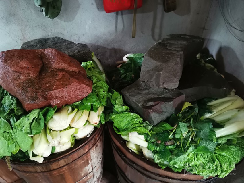 舊時化林坪家家都做鹽菜炒臘肉,為何李汝珍卻能在周家客棧的灶上烹調(diào)出這獨一份美味呢,原因就在這鹽白菜上面。據(jù)周家后人講述,李汝珍當(dāng)年對鹽白菜的制作頗為在行,從選材、抹料到腌制、晾曬,每個步驟每一種材料都非常講究。她用作腌菜的食材需葉片長肉質(zhì)厚的半包心本地大白菜,花椒粉則選用麻香味醇的漢源花椒,所需之水必須為本地山泉,她還特意在腌制時加入茴香苗、藿香葉等香料,在木桶或水缸上以巖石加壓更是匠心獨具。精心制作的鹽白菜,常常晾曬于客棧屋檐下或墻外各處,以其醇香之味吸引客人前來。久而久之,周家客棧鹽白菜的美味之名被背夫們帶到各地,“鹽白菜炒臘肉”也成了茶馬古道上的一道名菜。