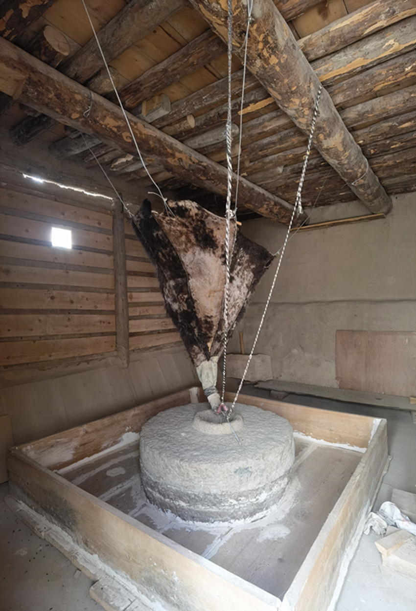 一條約三米寬的水渠橫穿眼前,水渠在側(cè)面依次開(kāi)了七個(gè)口子。上游三個(gè)用來(lái)排水,冬天用隔板擋著,夏天則用來(lái)泄水。中游三個(gè)口子都是磨坊的動(dòng)力來(lái)源。走進(jìn)去是一處水磨坊,三座半徑約0.8米的石磨間隔1.7米一字排開(kāi)。頂端是牛皮制成的青稞喂料器,由四根繩子系在房間頂角的不同方向;尾端是由牛角制作的喂料嘴,略顯復(fù)雜的繩拉式調(diào)節(jié)器錯(cuò)綜復(fù)雜,但卻精妙無(wú)比地控制著青稞的出料速度。