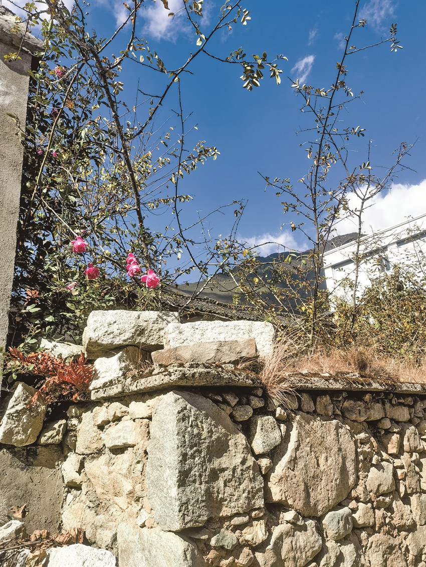 在小飯館里簡單吃了一頓午餐,可惜沒有嵐安豆花,臘肉倒是如大家說的那樣香。吃完飯在村子里漫無目的的轉悠,石頭砌的矮墻將每家每戶的房屋圍成院子,墻頭上的草已經泛黃枯萎,偶爾有幾枝玫紅色的月季從墻頭伸出來,給石墻點綴了一些色彩和生機。石墻與石墻之間,是串聯(lián)起每一戶人家的村間小道,經過幾戶農家,腳下硬化的路面斷了,往前延伸的是窄小的泥路,路兩旁有綠油油的菜地,有收割完的玉米地,有一排排的蘋果樹……往更遠的地方看去,田地盡頭的山坡上是紅軍紀念碑,原來這里可以通往紀念碑,不過目測距離有點遠,收住腳步往回走,沿著村道朝另外一個方向走走看。前面是散落在小山坡上的幾戶人家,比起之前被石墻圍起看不見樣貌的農家,山坡上的這些房子錯落有致,清楚的看得見院子的全貌,房屋大多是一層的由石墻瓦頂構筑的,每一戶人家都飄揚著鮮艷的紅旗。