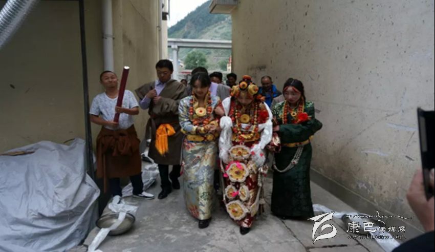 接親。除表現(xiàn)主人的熱情、好客、大方外,還要講究氣派,顯富有、高檔次、高規(guī)格。以娶親為例,舉行婚禮的當(dāng)天,男方要組織數(shù)十匹馬隊(duì)或高檔汽車(chē)接親,披金掛銀,蔟新華麗。接親的馬隊(duì)從新娘家出發(fā)后,男方要在家或路過(guò)人家必經(jīng)之地設(shè)置吉祥物,如盛滿一桶水或鋪一床藏毯、或隨身衣物鋪在地上,當(dāng)接送新娘的馬隊(duì)路過(guò)時(shí),接親的人要給吉祥物獻(xiàn)哈達(dá)和拋撒銀錢(qián)、紙錢(qián)和糖果等以示新娘路遇彩頭、沖喜,表示吉祥如意。到男方家后新娘被扶下馬或扶下車(chē),高僧大德頌吉祥詞后,圍繞所放佛像或吉祥八寶圖及裝滿水或牛奶的銅鍋?lái)樲D(zhuǎn)三圈后,踩著從大門(mén)口鋪至經(jīng)堂的藏毯進(jìn)屋,進(jìn)入客廳之前新娘只身先進(jìn)廚房,點(diǎn)燃灶里準(zhǔn)備好的柏香紅木或枝葉進(jìn)行熏煙,據(jù)藏醫(yī)考證熏香煙對(duì)身心健康有益,也可表示從即日起新娘便是男家的主婦了。