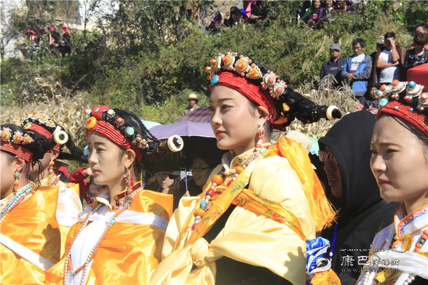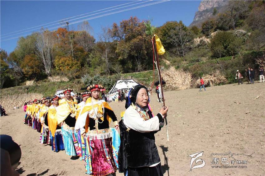 所有的祈福儀式結(jié)束后,村子里一位德高望重的長(zhǎng)輩走上圓臺(tái),用雄渾有力的嗓音向場(chǎng)地外等候的人們發(fā)出指令。在一段念詞結(jié)束之后,參加成人儀式女孩們的父親們?cè)谝晃焕先说闹敢戮従彽南驁?chǎng)地中央走來(lái),老人手舉一幅一米高的唐卡畫,口中念念有詞,走在他后面的父親們一襲白色的毪衫,頭戴一頂灰色的禮帽,腳穿紅黑相間的藏靴,頸上掛著一根潔白的哈達(dá),滿臉肅然的緊隨老人之后,來(lái)到月形的臺(tái)子邊,站成一個(gè)半圓形。當(dāng)父親隊(duì)站定后,母親隊(duì)們也向場(chǎng)地中移步而來(lái),本次成人儀式的主角們?cè)谝晃焕习尩膸ьI(lǐng)下向場(chǎng)地中走來(lái),每一位女孩穿著打扮都是那么的光鮮靚麗,每一個(gè)人都顯得美麗動(dòng)人,她們披著黃色的披風(fēng),一根白色的哈達(dá)在胸前打著結(jié),五顏六色的哈達(dá)懸掛在這根哈達(dá)上,在姑娘們的后背迎風(fēng)飄飛。走到圓臺(tái)邊,小女孩們也圍成半圓,低著頭,等待著喇嘛們的念經(jīng)祈福和家人的祈福。此時(shí),兩位吉祥老人站了起來(lái),手中拿著凈瓶,走到姑娘們面前,一邊念誦經(jīng)文,一邊將手中凈瓶里的水倒在姑娘們的手心里,姑娘們則虔誠(chéng)的將這圣水輕輕的抹在自己的額頭上,寓意吉祥如意。待喇嘛主持儀式結(jié)束后,主持儀式的老人用嘉絨語(yǔ)向蒼天和墨爾多神山祈禱,希望神賜予孩子們美麗的面容和美好的心靈,從今日起,她們就可以真正的長(zhǎng)大成人了。吉祥詞念誦完后,母親們排著長(zhǎng)長(zhǎng)的隊(duì)伍緩緩來(lái)到孩子們的面前,將懸掛在胸前的哈達(dá)取下,久久的凝視著女兒的臉,眼角掛著幸福的淚水,用顫抖的聲音為女兒祈福,叮囑孩子們要孝敬父母,做一個(gè)正直善良的人,然后,才將白色的哈達(dá)掛在女兒的頸上,父親們則站在原地,看著母親們將哈達(dá)和祝福送給女兒,見(jiàn)證著女兒們的長(zhǎng)大成人。接受完父母和長(zhǎng)輩們的祝福之后,盛大的鍋莊舞會(huì)開(kāi)始了。小女孩們也跟隨著這些舞者們手牽著手走到場(chǎng)地中央,跳起歡快的鍋莊舞。擁忠大娘說(shuō),成年禮上的鍋莊舞會(huì)一般都要視參加成人禮儀式女孩們親戚多寡而定,每一名長(zhǎng)輩都會(huì)走到場(chǎng)地中牽頭,跳起舞蹈,這時(shí)候是女孩的長(zhǎng)輩們炫耀舞技和歌聲的時(shí)候,他們矯健的舞步和甜美的歌喉迎來(lái)眾人的和鳴。