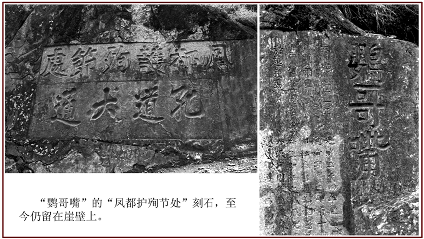 緊靠“鸚哥嘴”的,便是兩行從右至左、一上一下的橫書巨刻:“鳳都護(hù)殉節(jié)處”和“孔道大通”。它分明詔告世人,當(dāng)年那埸把康巴藏區(qū)鬧得個(gè)地覆天翻的大戲,便是從這里揭幕的。