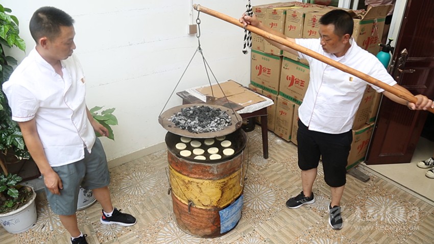用酥皮包裹好餡料,放入模具內壓緊壓實。點心脫模后在點上屬于“周聾子點心”的獨家標記(四瓣花),便可進入烤制流程,烤爐分為上鏊與下鏊。首先將吊爐上下火都提前預熱至250°左右,然后把制作好的點心正面朝下放在吊爐里,最后將上鏊移入吊爐上方,進行點心的烤制。根據經驗確定烤制時間,當?shù)鯛t里飄出香味后,即可將上鏊挪離吊爐。點心背面呈現(xiàn)出“偷油婆色”(焦黃色)后,迅速將點心翻面,繼續(xù)烤制成褐色,出爐即可食用。