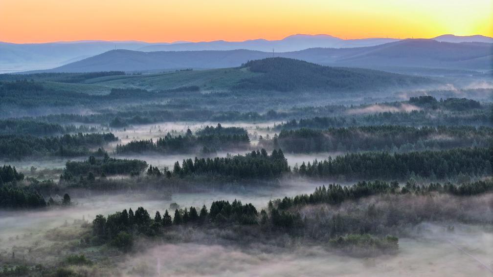 ??7月5日清晨,位于河北省承德市的塞罕壩國家森林公園雨后晨霧飄渺、滿目青翠(無人機(jī)照片)。