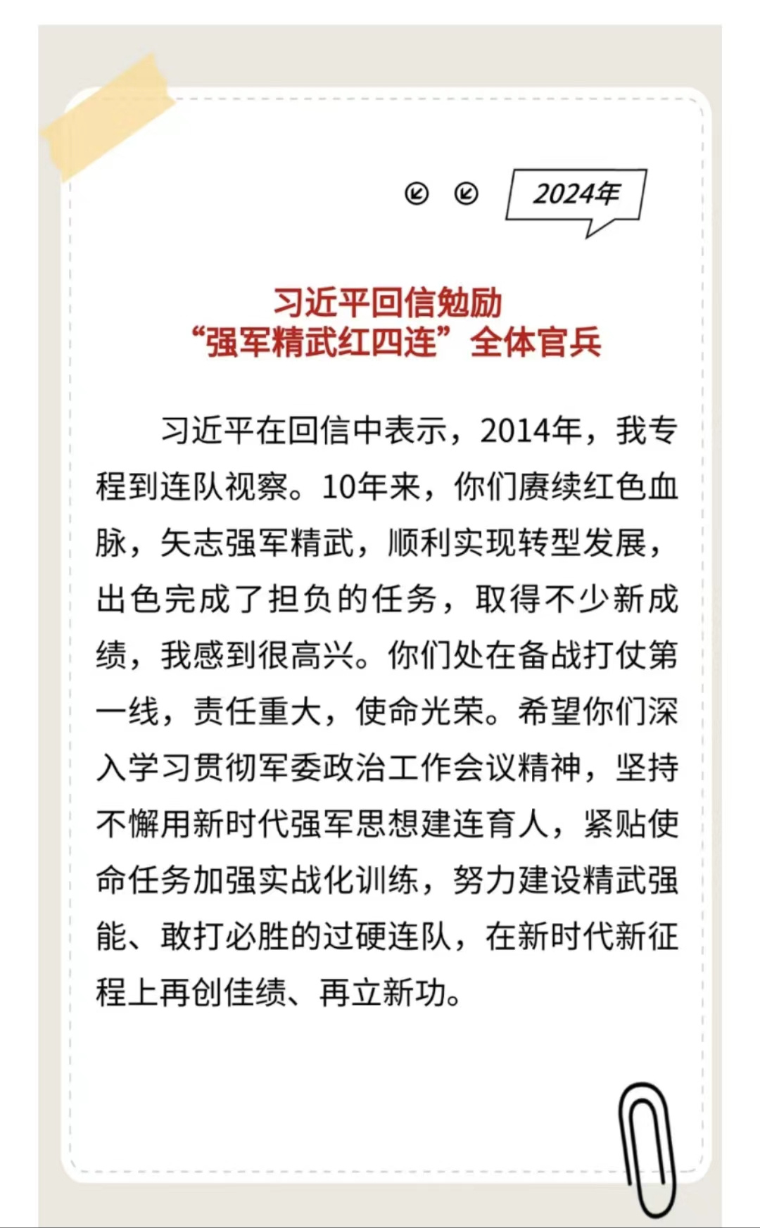 在回信中,習(xí)主席提到2014年到連隊視察的往事。