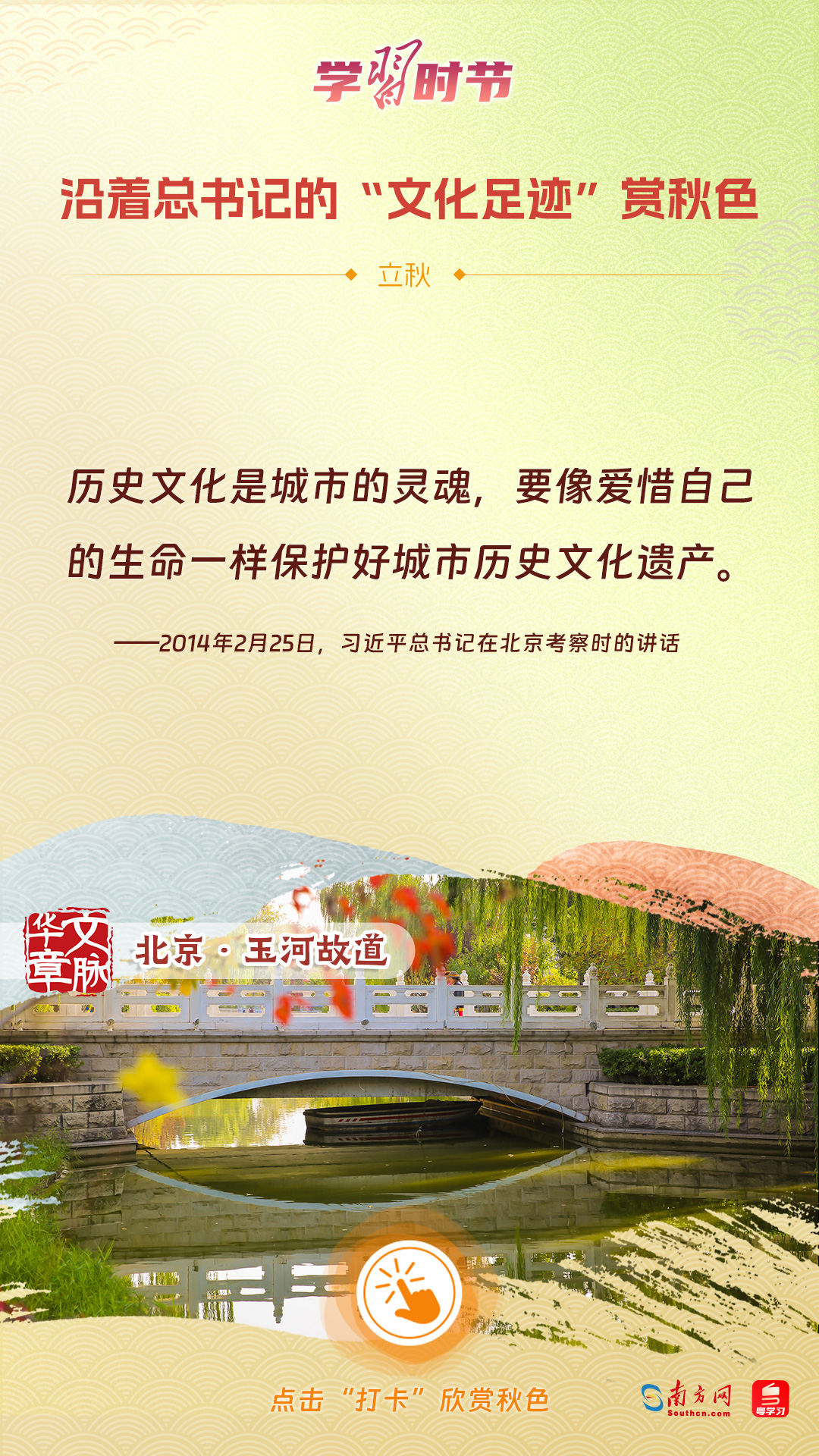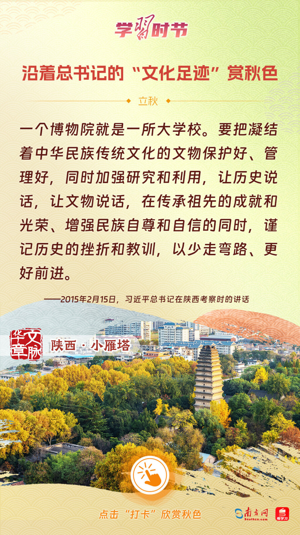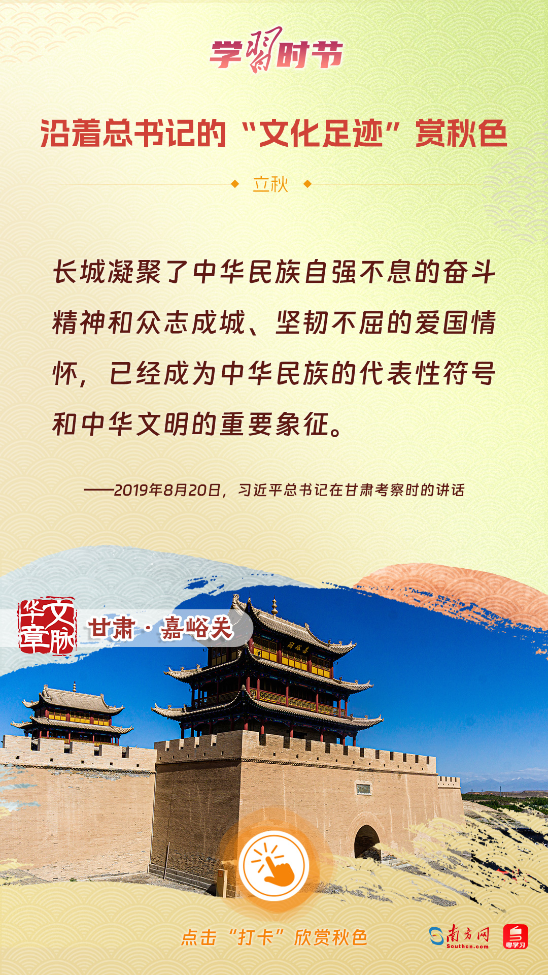 立秋之際,讓我們一起跟隨習(xí)近平總書記的足跡,學(xué)習(xí)習(xí)近平總書記關(guān)于文化建設(shè)的重要論述,感受全國各地文化地標(biāo)古跡的秋意,汲取文化自信的強大力量。