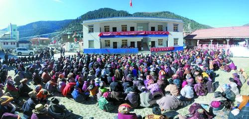 在白玉縣的宣講現(xiàn)場(chǎng),《甘孜日?qǐng)?bào)》藏文版成了“搶手貨”。白玉縣委中心報(bào)道組 攝