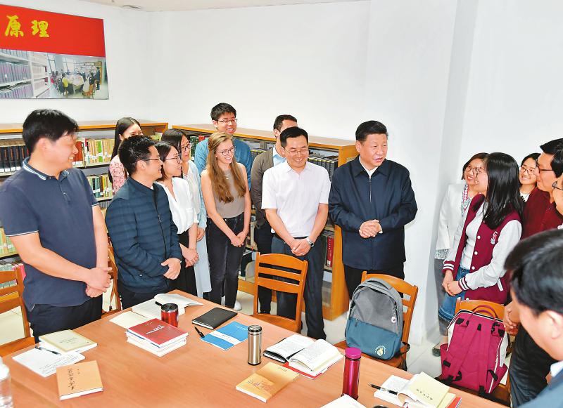 5月2日,中共中央總書記、國家主席、中央軍委主席習(xí)近平來到北京大學(xué)考察。這是習(xí)近平在北京大學(xué)馬克思主義學(xué)院,與正在就“解讀新時(shí)代”進(jìn)行座談交流的中外學(xué)生親切交談。 新華社記者 李濤 攝