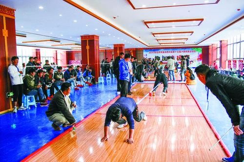 今年,我州將由115名運(yùn)動員、教練員等組成11支運(yùn)動隊,參與賽事設(shè)置的8個競賽項目和2個表演項目,其中有兩支隊伍將參與綜合類表演項目比賽。我州總參賽人數(shù)相比上一屆略有減少。我州參加綜合類表演項目比賽的節(jié)目是《瑪亞切通》和《炯動》?!冬攣喦型ā纷g為孔雀吃水,主要體現(xiàn)力量和平衡的動作;《炯動》取材于藏民族農(nóng)村修建房屋時的勞動場面,以青年男女在勞動過程中載歌載舞對歌或比拼勞動成果、質(zhì)量、進(jìn)度為內(nèi)容,主要比拼身體的力量和靈活度。我州參加競技類表演項目比賽的節(jié)目是《嘎久》?!陡戮谩芬鉃榉嗰R鞍或吉祥翻越,是藏族人民節(jié)日聚會時的一種競技體育活動,主要比拼靈活性、趣味性和技巧性。