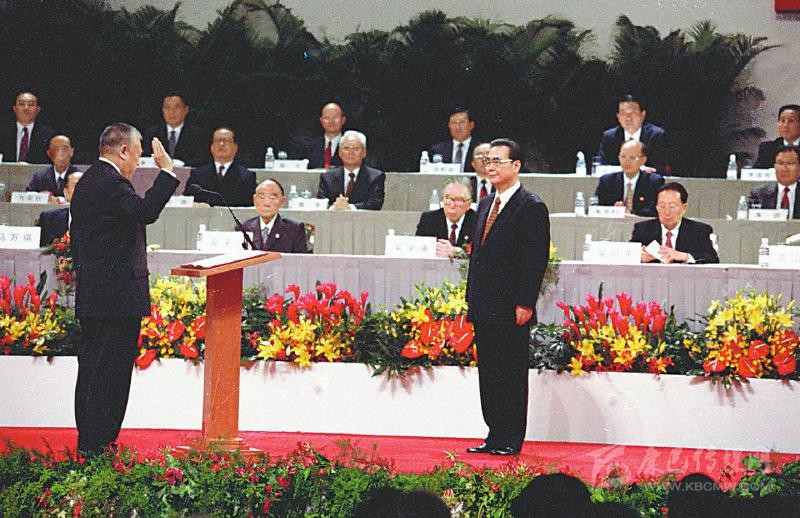1997年7月1日凌晨,中華人民共和國香港特別行政區(qū)成立暨特區(qū)政府宣誓就職儀式在香港會議展覽中心新翼七樓隆重舉行。香港特區(qū)首任行政長官董建華宣誓就職,李鵬同志監(jiān)誓。 新華社記者 劉建國 攝