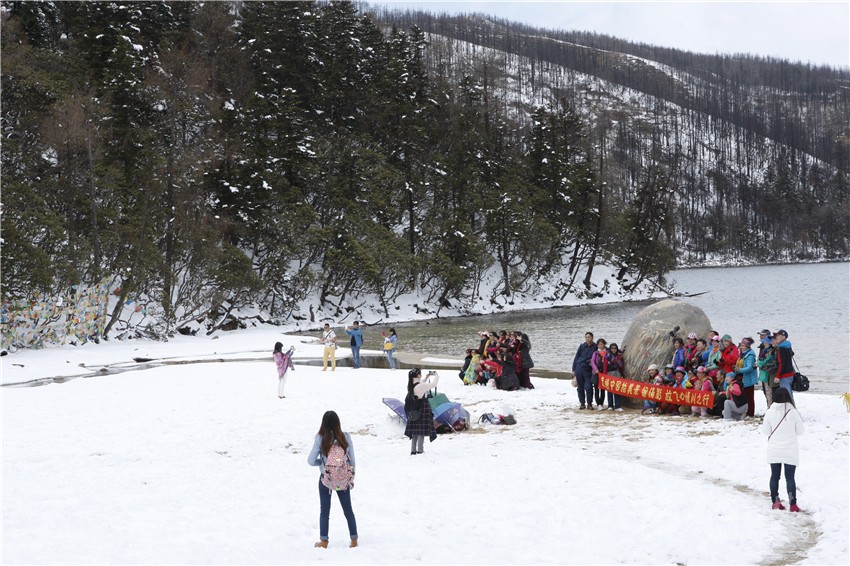 在雪中游玩的游客。