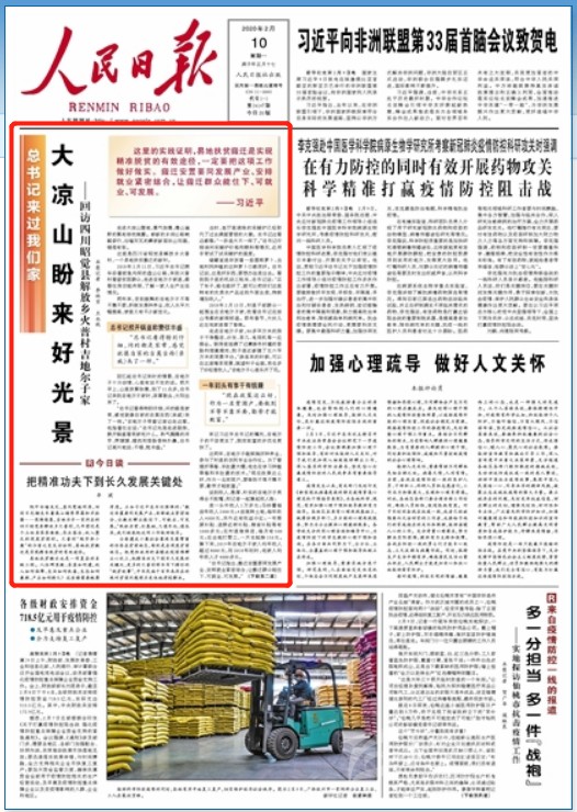2月10日出版的《人民日?qǐng)?bào)》,在頭版刊登了《大涼山盼來(lái)好光景》的報(bào)道,聚焦四川昭覺縣解放鄉(xiāng)火普村易地扶貧搬遷,村民不等不靠不要,積極發(fā)展種養(yǎng)業(yè),彝家兒女奔向充滿希望的新生活。