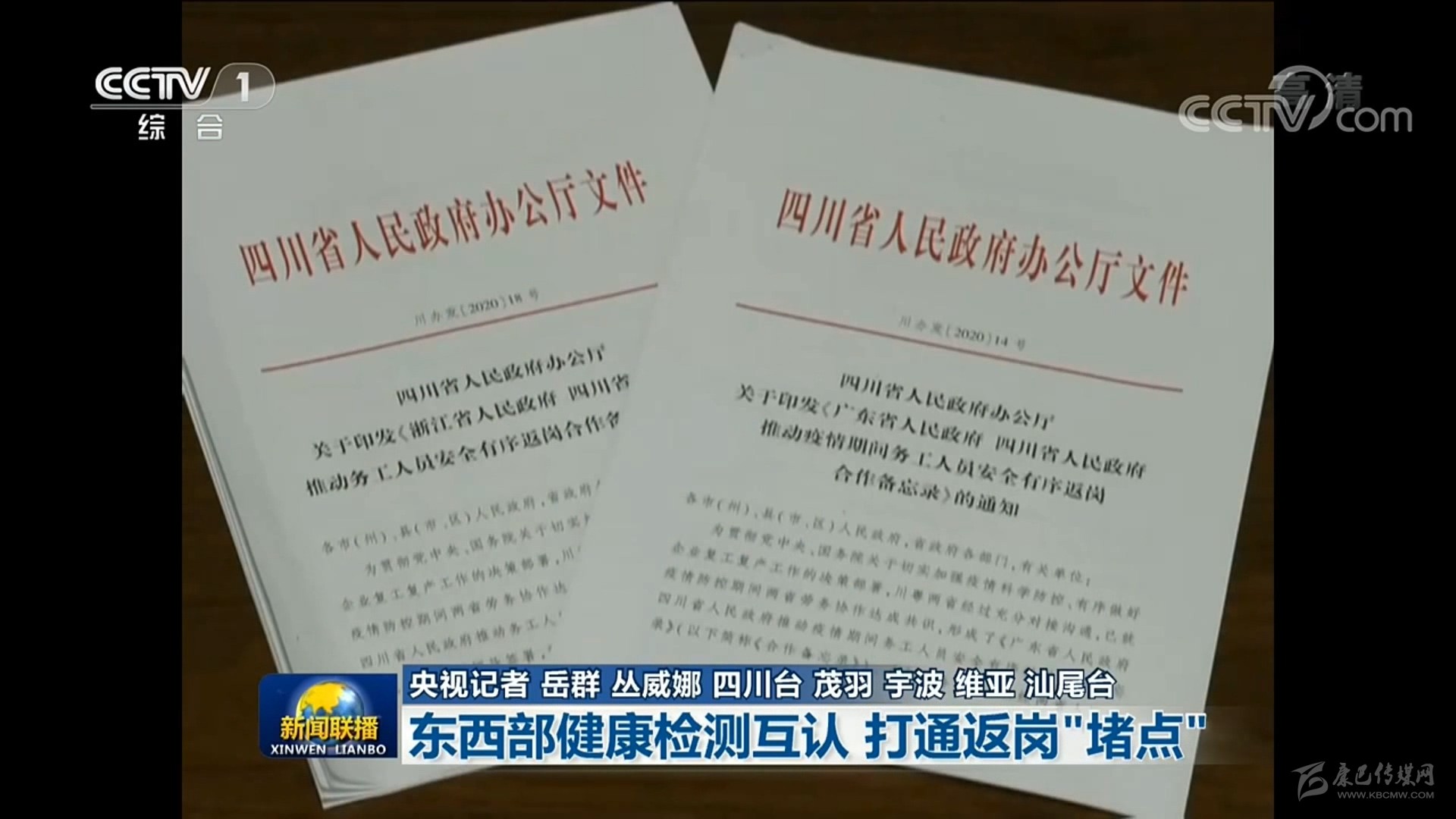 為了讓外出務(wù)工人員順利走出家門返崗,四川務(wù)實(shí)推出“健康碼”,又主動(dòng)和7省市簽署《合作備忘錄》,成為第一個(gè)和其他省建立起健康檢測(cè)互認(rèn)工作機(jī)制的省份。今天的《新聞聯(lián)播》單條關(guān)注了這一全國(guó)創(chuàng)新之舉,央視聯(lián)手四川廣播電視臺(tái)探尋機(jī)制背后的邏輯。來看川臺(tái)記者的一線調(diào)研采訪。