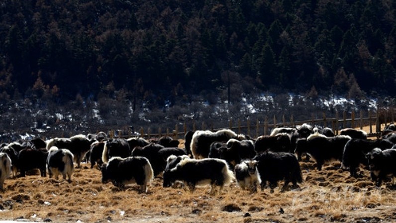 這是甘孜藏族自治州境內(nèi)的景象,森林、草甸、河流、牦牛還有皚皚白雪(2016年12月31日攝)。新華社記者 陳天湖 攝