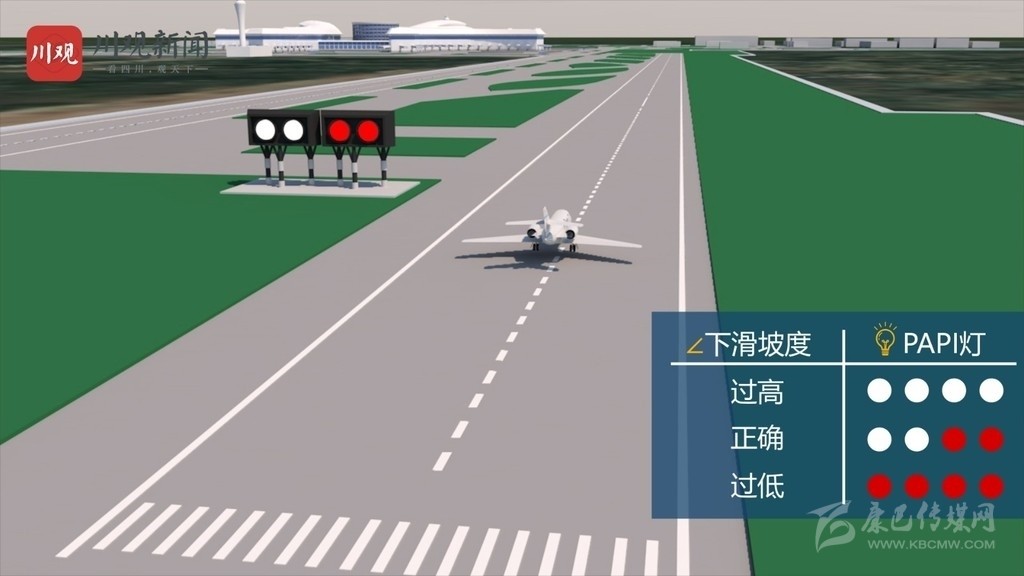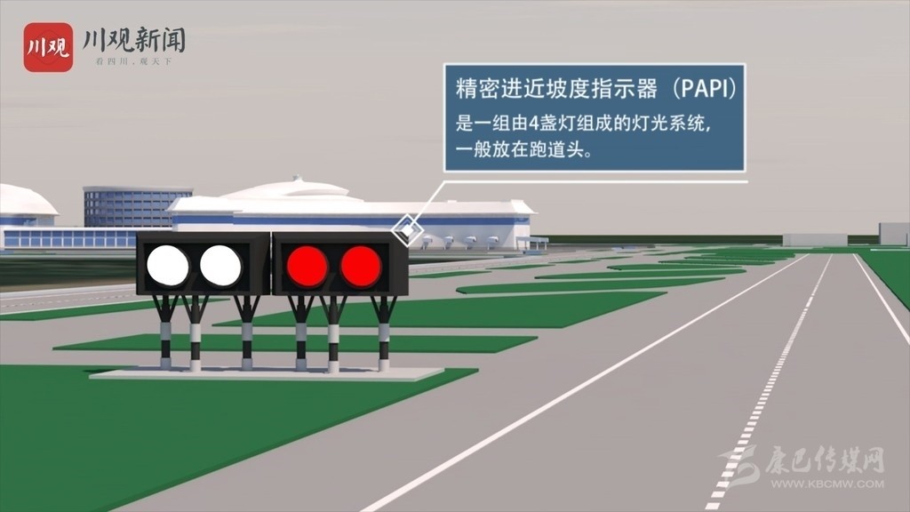 緊密進近坡度指示器(PAPI),是一組由4盞燈組成的燈光系統(tǒng),一般放在跑道頭。飛行員從空中觀察,如果高于預定下滑道,PAPI燈顯示全白,反之則顯示全紅。飛行員如果看到兩紅兩白的PAPI燈,就說明飛機下滑坡度正確,能夠安全降落。
