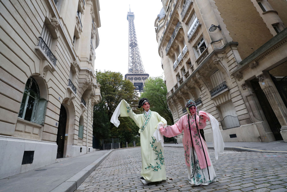 2023年9月13日,江蘇省演藝集團昆劇院院長施夏明(左)和江蘇省演藝集團昆劇院國家一級演員孔愛萍在法國巴黎埃菲爾鐵塔附近參加昆曲快閃。新華社記者 高靜 攝