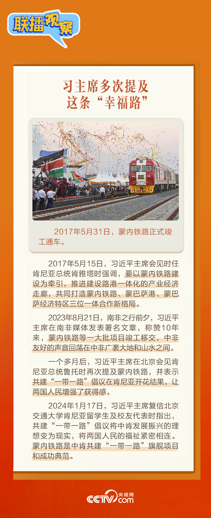 此前,習(xí)主席在外事活動中多次提及蒙內(nèi)鐵路,《新聞聯(lián)播》也持續(xù)關(guān)注這條路的建設(shè)及開通后的運(yùn)營情況。這條“幸福路”有何特別之處,習(xí)主席為何頻頻提及?它的建成通車給當(dāng)?shù)貛砟男┳兓??《?lián)播觀察》邀您一同了解。