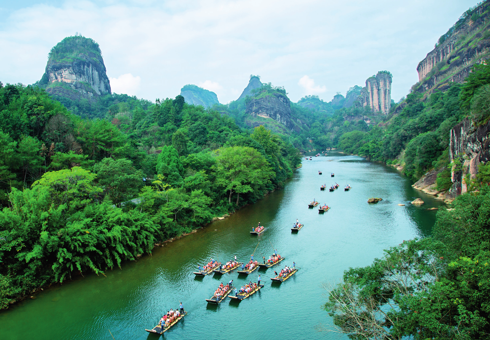 ??游客在福建省武夷山國(guó)家公園九曲溪乘船游覽(2023年10月3日攝)。陳穎攝/本刊