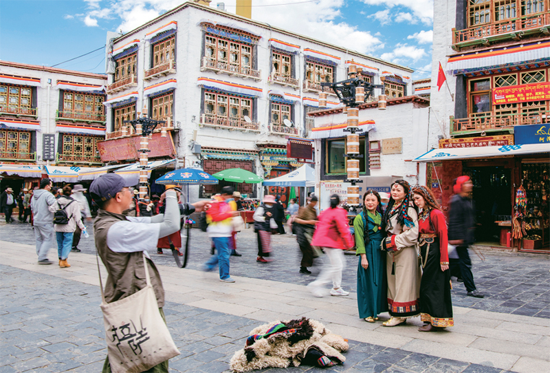 千年八廓街,見證民族團結。2021年7月,習近平總書記來到位于西藏拉薩老城區(qū)的八廓街,感慨地說:“千年八廓街,是我們各民族建起來的八廓街。各民族文化在這里交流交往交融,我們中華民族的大家庭在這里其樂融融。”圖為2023年6月13日,游客身著藏裝在八廓街拍照留念。 新華社記者 姜帆/攝