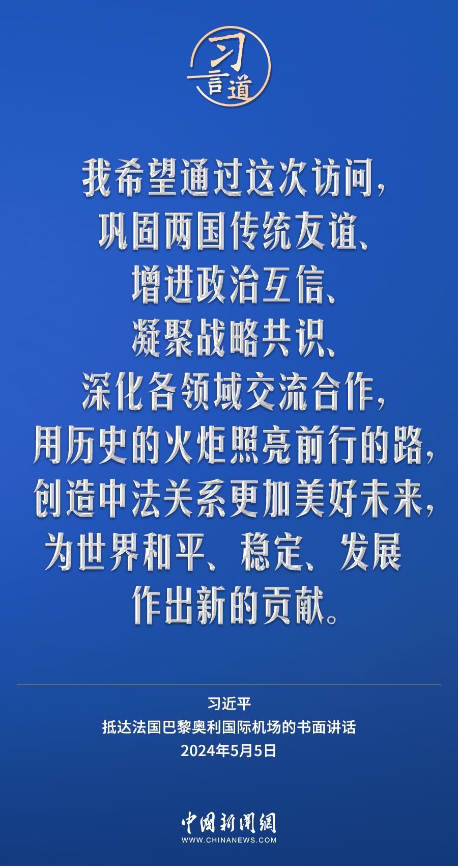 當(dāng)?shù)貢r(shí)間5月5日下午,國(guó)家主席習(xí)近平抵達(dá)巴黎,開始對(duì)法國(guó)進(jìn)行國(guó)事訪問。在抵達(dá)法國(guó)巴黎奧利國(guó)際機(jī)場(chǎng)的書面講話中,習(xí)近平指出——
