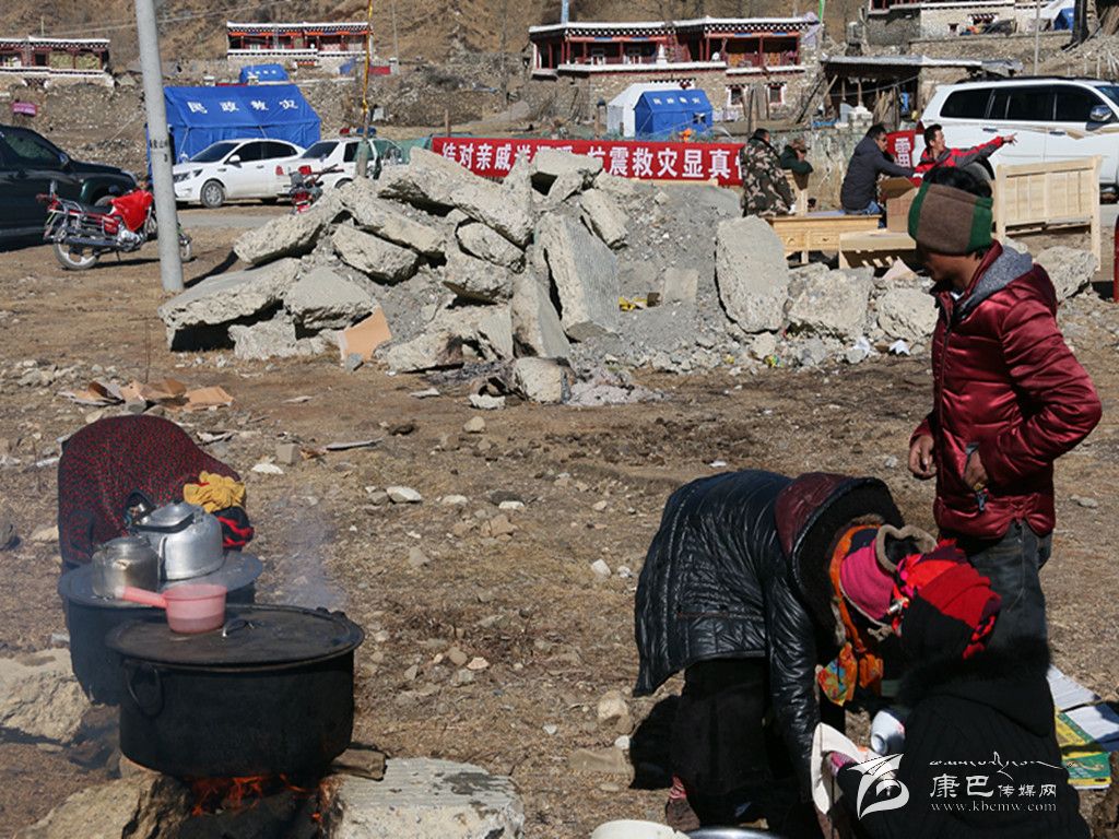 走進(jìn)八美鎮(zhèn)重災(zāi)區(qū)中古村災(zāi)民安置區(qū),第一眼就能看見戴著紅袖章的兩個(gè)村民正圍著兩個(gè)大灶轉(zhuǎn)來轉(zhuǎn)去忙個(gè)不停。村民巴青老人說:“災(zāi)后,我們隊(duì)的村民都集中安置在這里,為方便受災(zāi)群眾和前來幫忙的干部都能喝上一口熱茶,我們幾個(gè)村民臨時(shí)搭建了兩個(gè)‘三鍋莊’灶臺,用來燒清茶和開水,因?yàn)槲覀冎烙行└刹苛?xí)慣喝白開水,就特意準(zhǔn)備了一個(gè)燒白開水的鍋。”他指著正在搶修房屋的黨員服務(wù)隊(duì)說:“地震發(fā)生到現(xiàn)在,很多領(lǐng)導(dǎo)來看望我們,很多干部到村上幫助搶修房屋、運(yùn)送物資,這么冷的天,他們一直不停地在幫我們做事情,很辛苦!我們不能光等著干部們來給我們做事情,我今年68歲,雖然做不了大的事,但是給他們燒茶遞水是沒有問題的。”