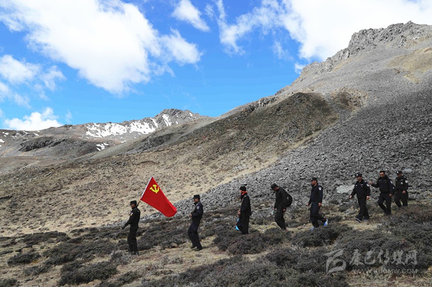 為確保蟲草采挖期間的社會(huì)治安穩(wěn)定,縣公安局抽調(diào)精干力量,前往哈幾山、莫庫(kù)溝等多個(gè)蟲草采挖點(diǎn)開展巡山維穩(wěn)。這次和我們一起開展常規(guī)巡邏的共有8名公安干警。降初是本地人,1.78米的個(gè)子,一路上,他高舉黨旗、步履矯健、勇往直前,成為我們大家的“領(lǐng)路人”,大家經(jīng)常和他開玩笑說:“跟著黨(旗)走永遠(yuǎn)不迷路”。