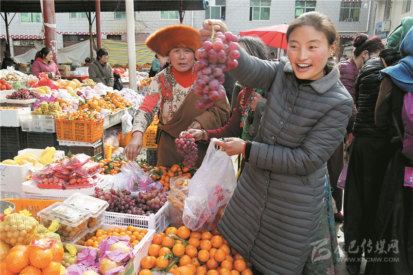 新都鎮(zhèn)格色村的丹真大哥和老伴兒其吉牽著8歲的孫子正在干果店里挑選各類干果,身后的背簍里水果、蔬菜、酥油、牛肉等農(nóng)畜產(chǎn)品以及中國結(jié)、年畫、對聯(lián)、掛圖等吉祥的節(jié)日物品應(yīng)有盡有。