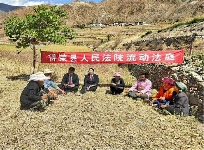 在曲雅貢鄉(xiāng)二號(hào)壩村進(jìn)行法律宣講時(shí),村民澤某請(qǐng)求法院判決其和丈夫扎某離婚,“流動(dòng)法庭”法官立即在田間地頭組織調(diào)解。調(diào)解過程中當(dāng)事人情緒抵觸、相互埋怨,尤其涉及到財(cái)產(chǎn)分割和子女撫養(yǎng)等問題時(shí)情緒波動(dòng)大,場(chǎng)面一度僵持。法官憑借豐富的調(diào)解經(jīng)驗(yàn),先從講解相關(guān)法律規(guī)定入手,告知當(dāng)事人享有的權(quán)利義務(wù),而后對(duì)離婚財(cái)產(chǎn)分割、子女撫養(yǎng)問題從情理法多角度層層剖析,促使雙方達(dá)成和解協(xié)議,有效化解了矛盾?!傲鲃?dòng)法庭”以宣促調(diào)、以案說(shuō)法,達(dá)到了審理一案、教育一片、穩(wěn)定一方的效果。